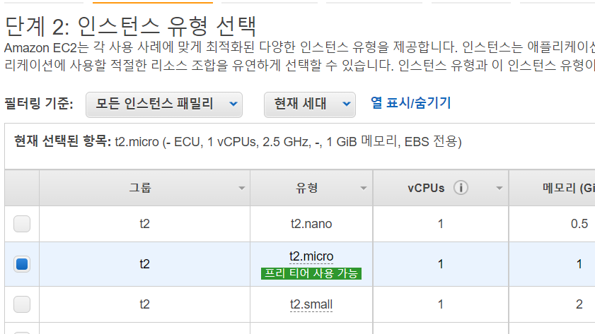 원하는 운영체제를 클릭 후 인스턴스 유형을 설정하여준다