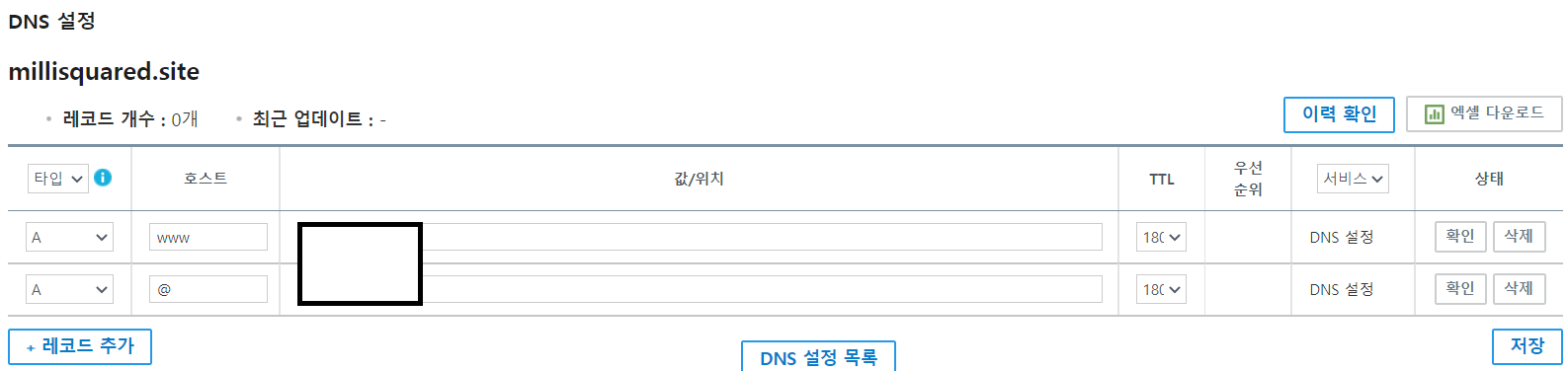 그 후 각 타입 및 호스트(www와, @), 값(생성된 AWS Instance의 퍼블릭 IP)을 채워 저장하여준다