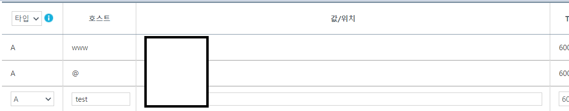 위의 +레코드 추가 버튼을 눌러 다음과 같이 test 의 이름을 갖는 sub domain을 만들 수 있게 된다.