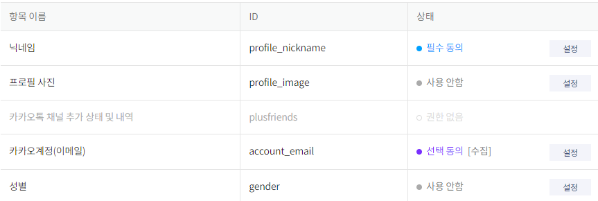 ※이 때 동의항목에서 다음과 같이 얻고자 하는 정보들의 상태정보를 바꾸어 주어야, 결과값을 가져올 수 있다.
