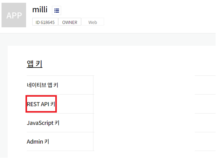 *이 때 Code 작성에서 사용될, REST API 키를 기억하여준다.*