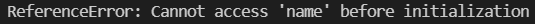 따라서 위와 같은 코드에서 선언 되기 전에 name을 참조하게 되면 let의 변수 name은 TDZ 구간에 존재해 있게 되고, 이 때는 메모리에 할당되어 있지 않아 참조에러(ReferenceError)를 일으키게 된다. 따라서 에러를 일으키지 않기 위해서는 let name='SJ' 코드를 먼저 실행시켜 name의 변수에 접근하기 전에 초기화를 먼저 해주어야 한다.