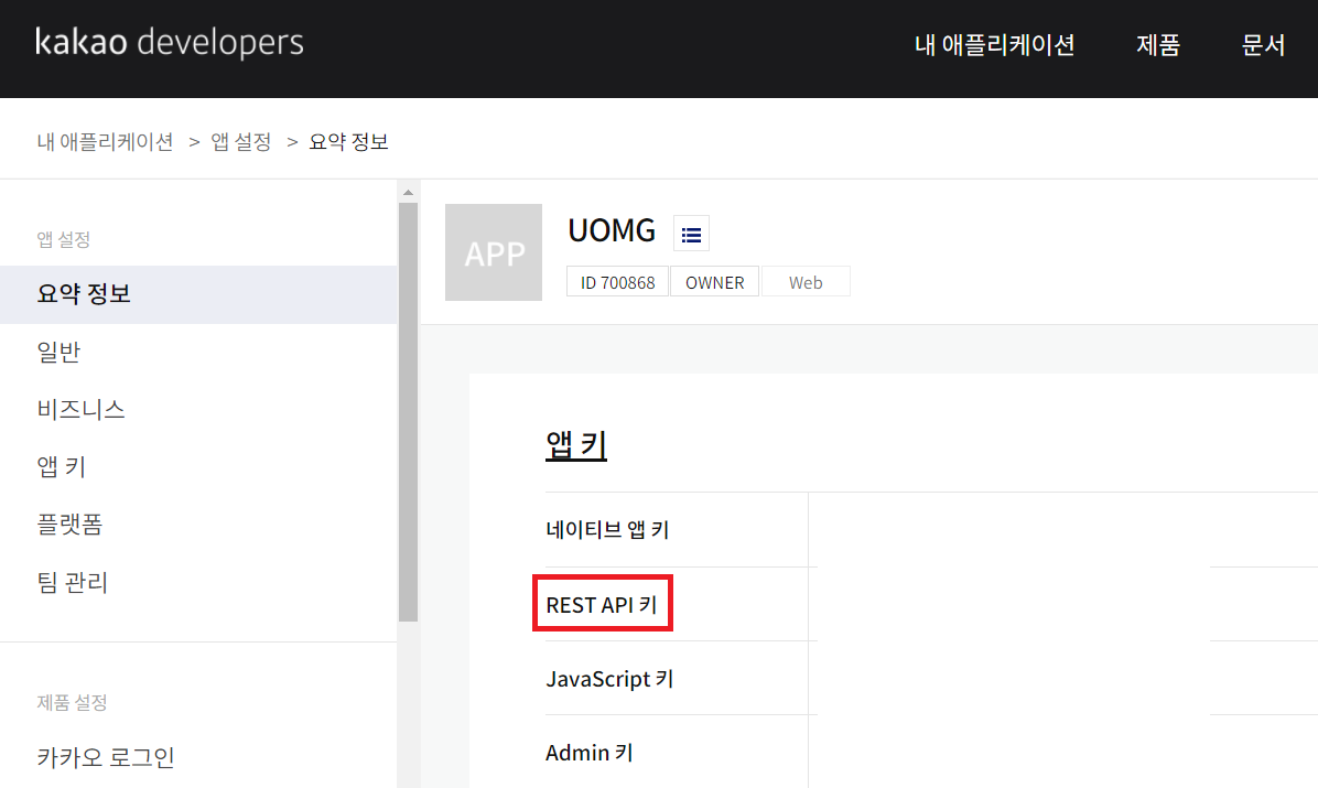 ④ 생성 된 애플리케이션을 클릭 후 요약정보에서 REST API Key를 복사하여 둔다.