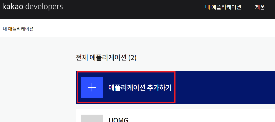 ① https://developers.kakao.com/ 로 접속들어간 후 내 애플리케이션을 클릭한다.