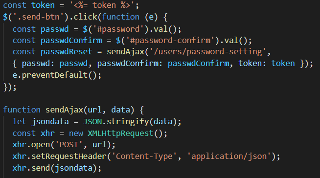 링크를 통해 페이지로 이동 한 후, URL에서 parameter로 넘겨받은 token 값과 함께 서버로 POST 요청을 해준다.