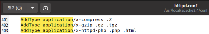 > httpd.conf 파일에 AddType application/x-httpd-php .php .html 을 추가하여 넣어준다.