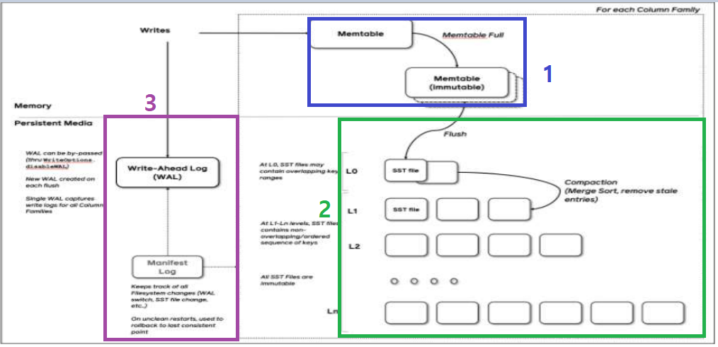 - WAL은 매 update 마다 disk와 memtable에서의 작업들을 기록(Log)한다. 이는 예기치 못한 상황으로 memory가 날라갔을 때 복구를 해주기 위한 작업으로 memtable이 성공적으로 disk에 저장되면 WAL은 삭제된다.